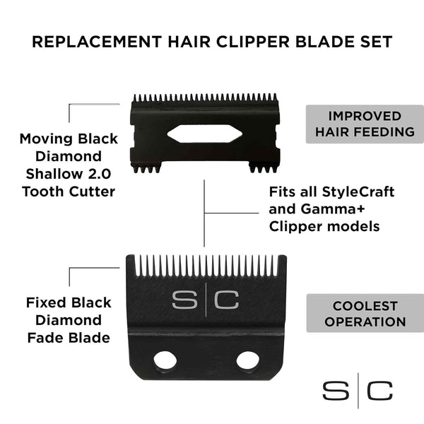 StyleCraft Replacement Double Black Diamond Carbon DLC Fixed Fade Blade with Shallow Tooth Cutter 2.0 Clipper Blade Set